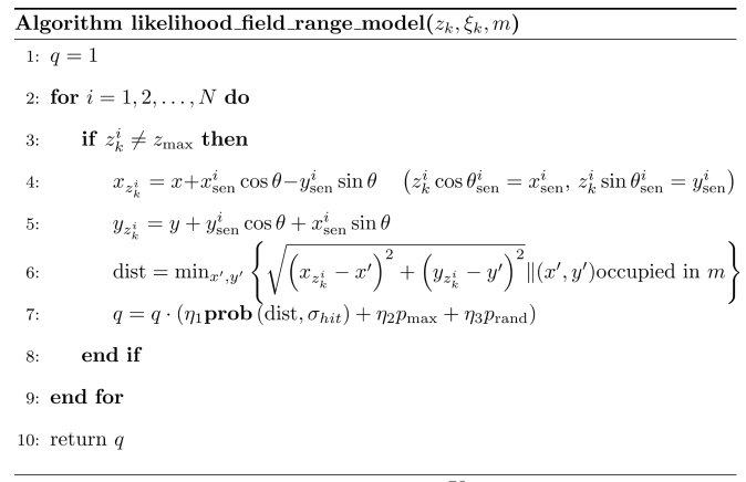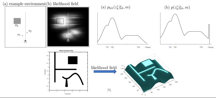 The classic Beam Model needs ray casting into the map for every beam to find the predicted hit; that’s accurate but slow. The likelihood field replaces ray casting with a precomputed distance-to-obstacle field.