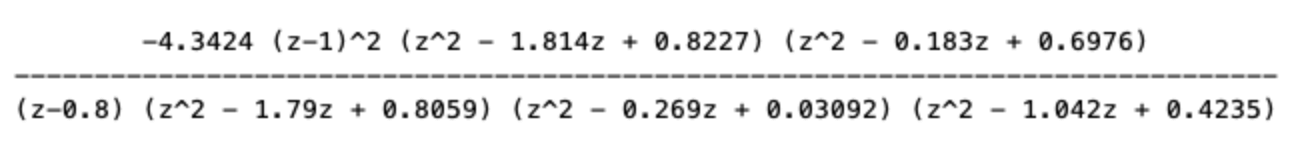 num_z = [-4.3847, 10.29922183, -9.04347049667, 4.138379743466, -1.033698812804]; den_z = [1, -2.3607, 2.29811242, -1.16099381228, 0.285702098583, -0.0349486756704]; Dz = tf(num_z, den_z, 0.2); % variable is z (implicitly)