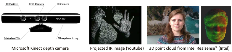 These are a family of depth cameras using infra-red images, comprising of a RGB camera, IR emitter and IR camera. IR cameras (structural or dot patterns) invisible to human eyes are projected to objects. The reflected image is captured by the IR camera to retrieve depth information (for each pixel).