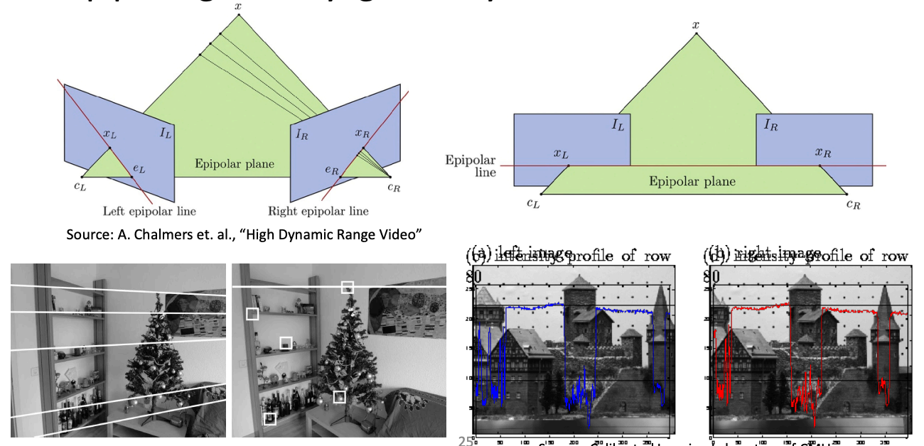 This plane intersects each image to form a left epipolar line and a right epipolar line. The two matching points must lie on their respective epipolar lines. Rectification simplifies things even more because the epipolar lines become horizontal, so that matching can be done row-by-row.