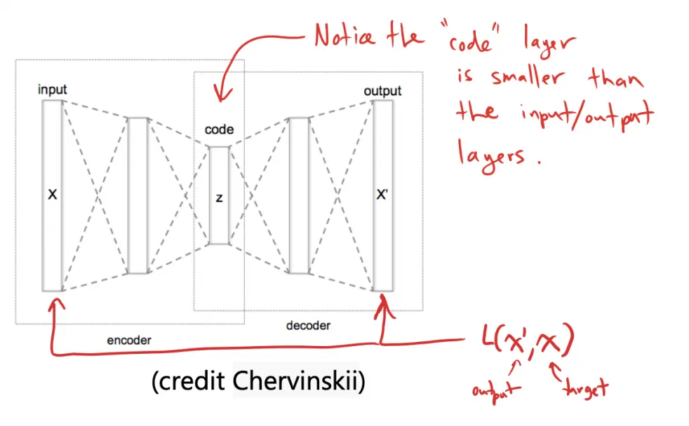 We can think of an autoencoder as just two layers: an encoder and a decoder. We can “unroll” it into 3 layers, where the input and output layers have the same size and have the same state, so that we have: input, hidden code, and reconstructed output.