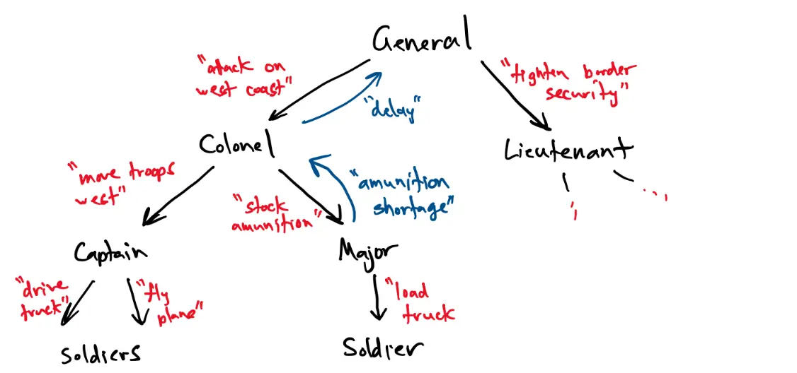 In predictive coding, predictions/commands are sent one way through the network, and errors/deviations are sent the other way. A good way to think about this is a military chain of command: