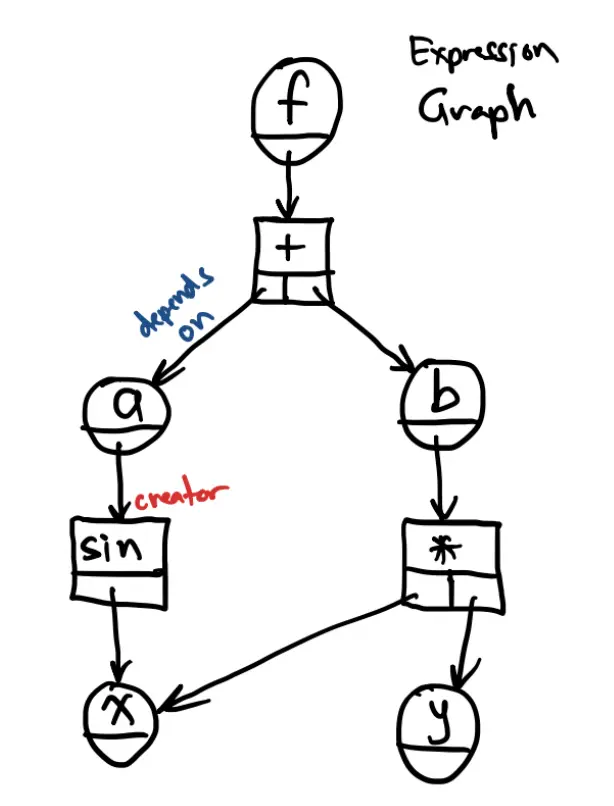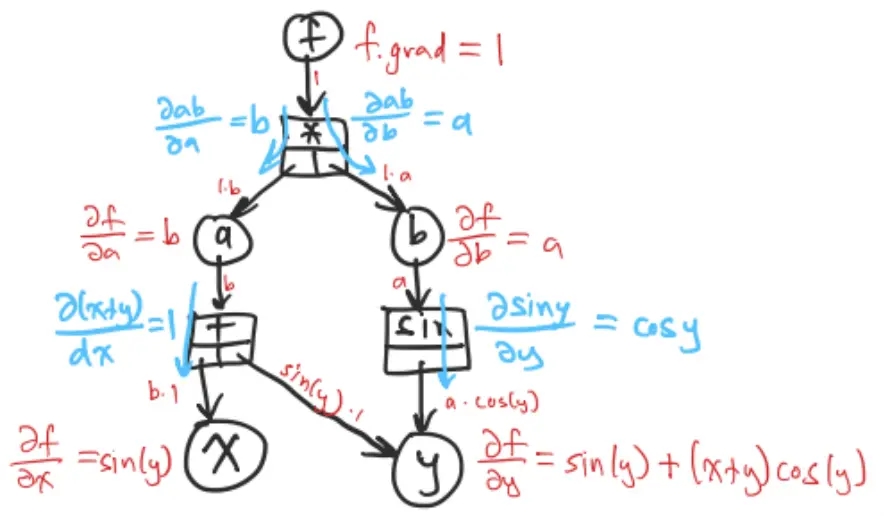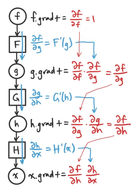 Starting with a value of at the top, we work our way down through the graph, and increment the grad of each Var as we go.