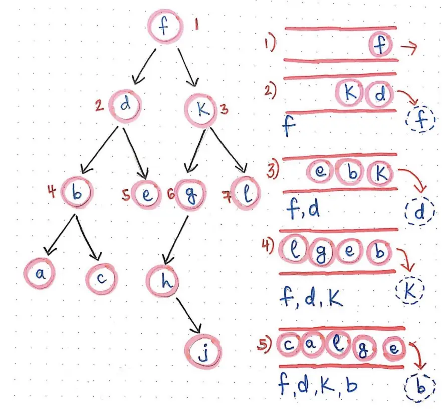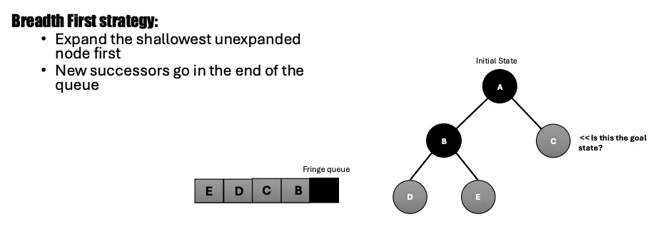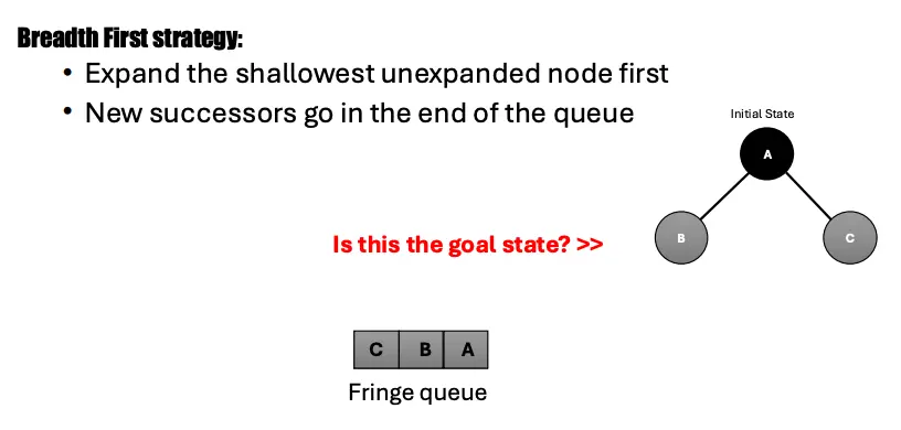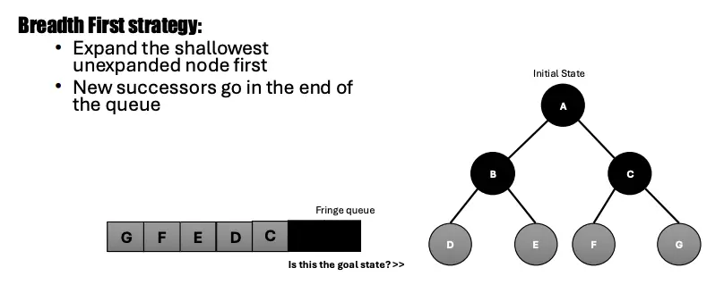 First, we expand the shallowest unexpanded node. New successors go in the end of the queue. (Right side is the start of queue for some reason)