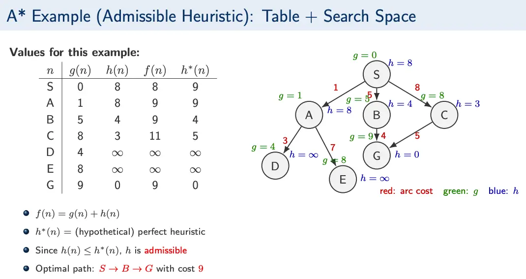 Recall that A Search defines an algorithm framework that combines the accumulated path cost with the heuristic cost to the goal in the evaluation function , such that
