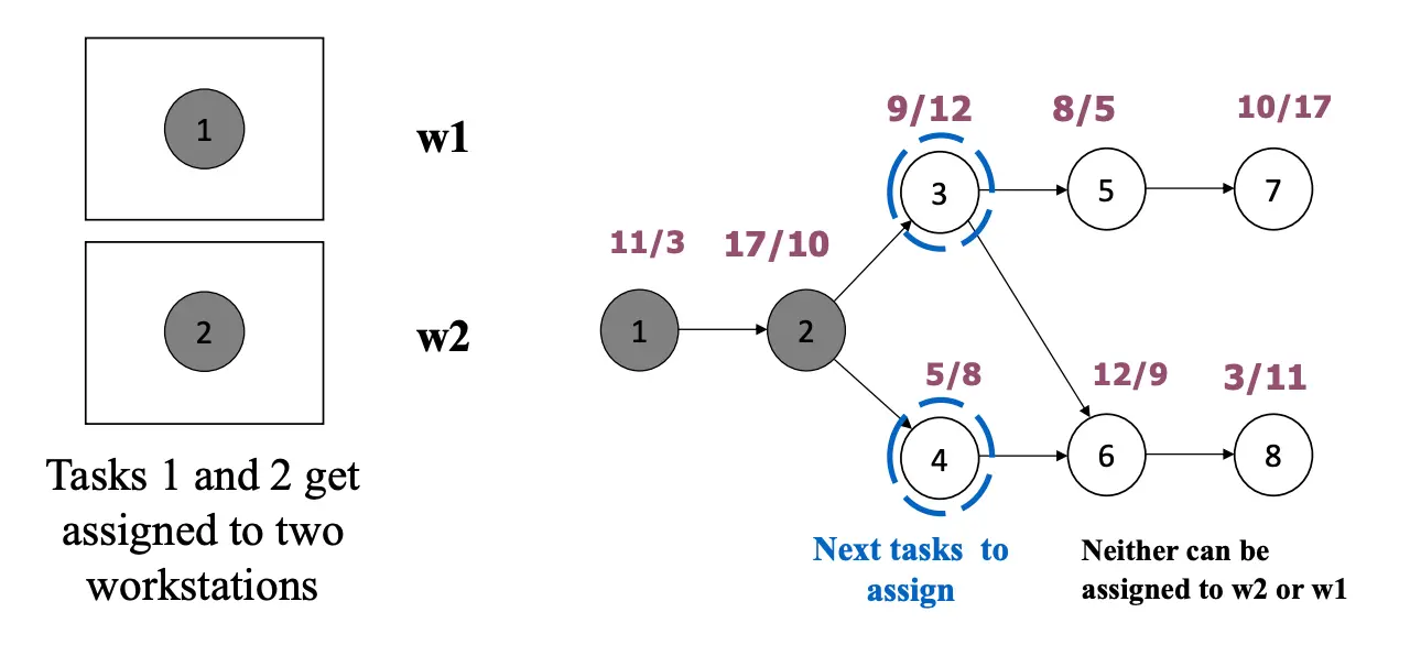 - If none of the tasks can be fit in the current workstation due to time or space capacity, open a new workstation
