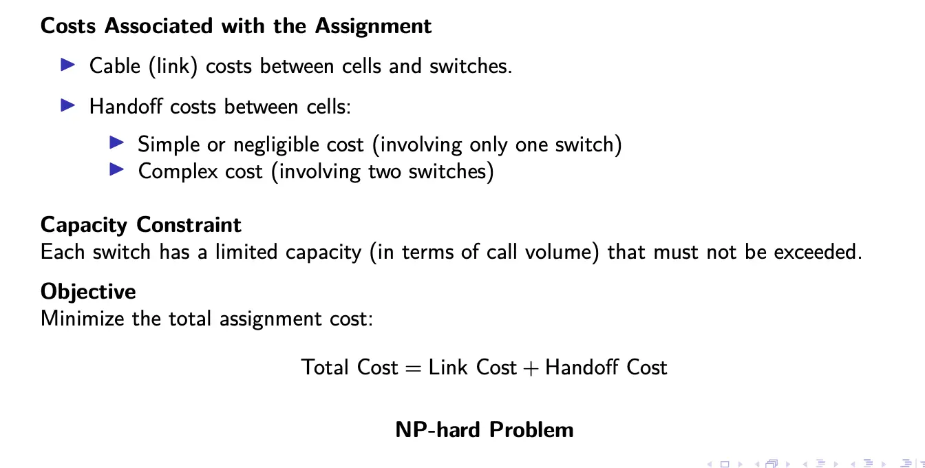 Given cells to be assigned to switches, where each switch has capacity , we need to find an assignment that minimizes: