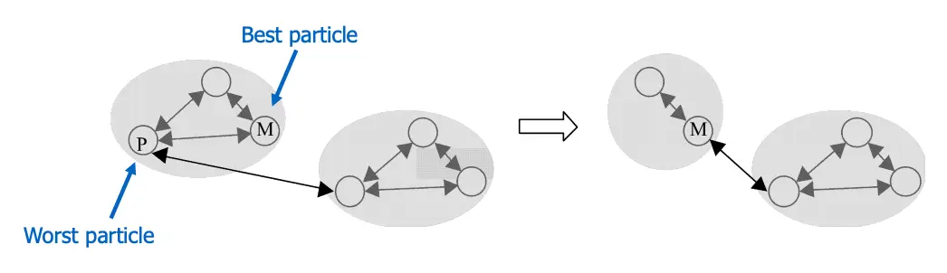 On the other hand, every bad tribe generates a new random particle simultaneously. All the new particles form a new tribe. Each particle gets connected to the tribe that generated it through its best particle.