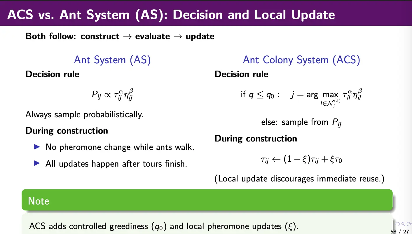 which temporarily reduces the attractiveness of recently used edges. Note that this is during construction, as the ants walk! In AS, the pheromones do not change while the ants walk, only updating after tours finish.