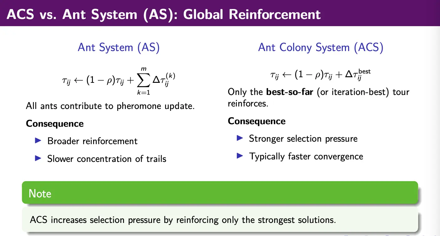 ACS is a stronger variant of ant colony optimization, introducing two key modifications over AS.