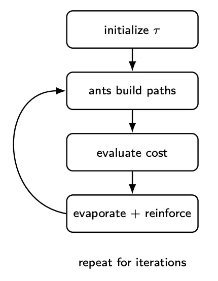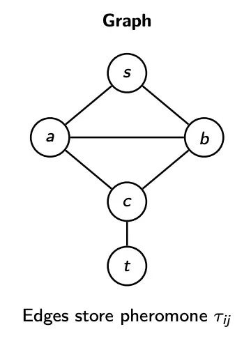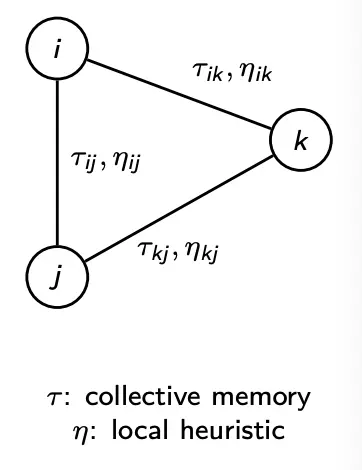 - Pheromone memory: Each edge has a pheromone level . High means that this edge often appears in good solutions. Pheromone is shared across the colony (collective memory).