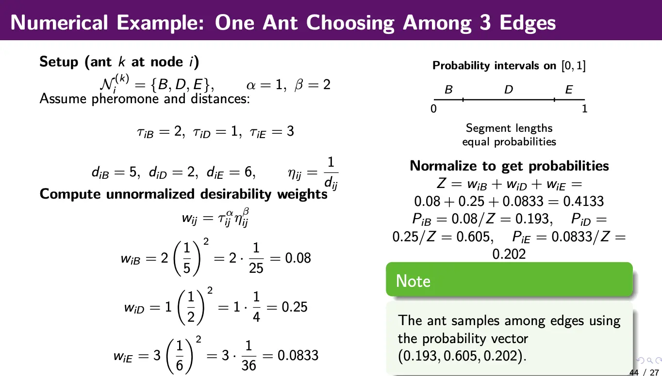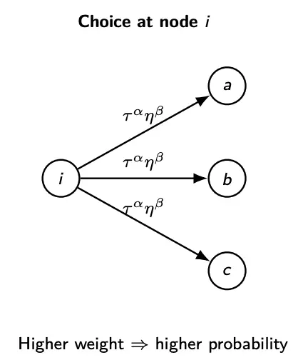 At node , an ant chooses the next node stochastically. It prefers edges with high pheromone , and edges with good heuristic . Because of randomness, we still allow exploration, such that non-best edges can be selected.