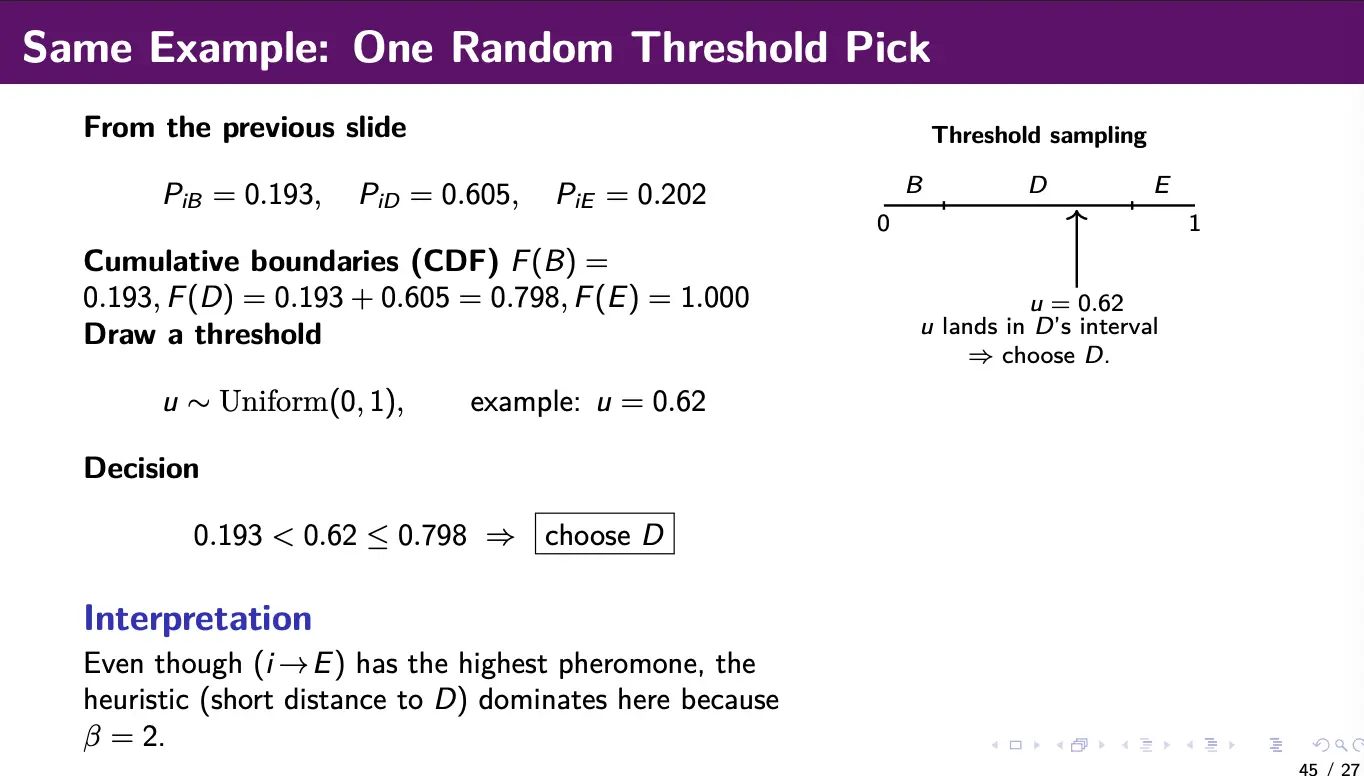 We can pick a next action through roulette-wheel sampling. We compute the transition probabilities using the formula above, draw a random threshold , then select the next city cumulative probability: