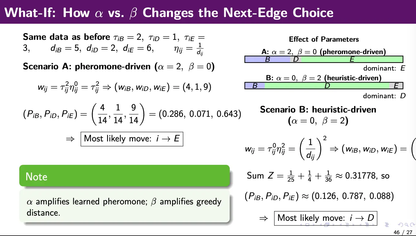 If , we are purely using heuristic (probabilistically greedy). If we are using , we are purely using pheromone (memory only).