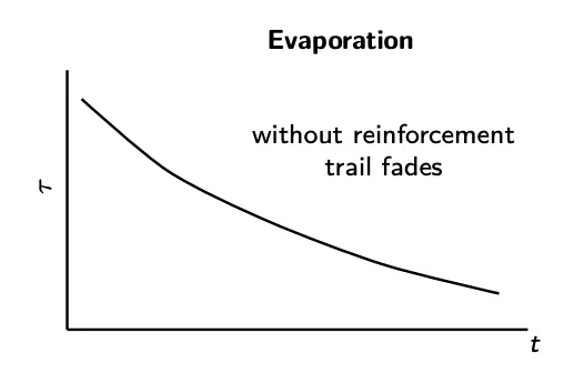 Thus, we can think of this pheromone update rule as combining the evaporation and reinforcement: