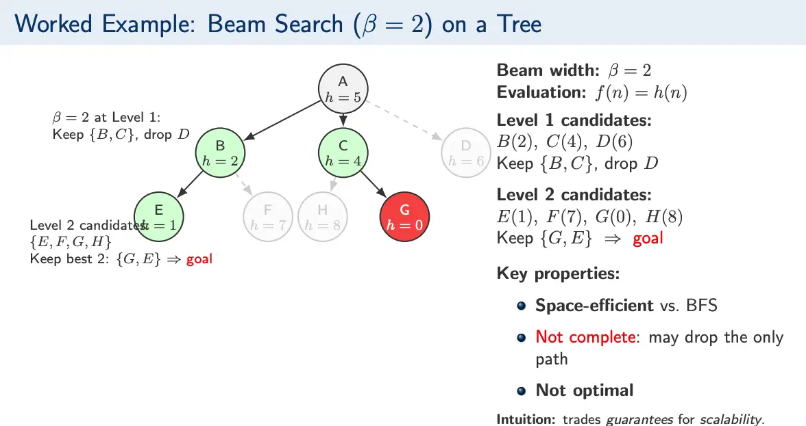 Beam search is an informed, memory-bounded variant of BFS. It reduces the memory cost of BFS, using heuristic information to guide expansion, trading away guarantees for scalability.