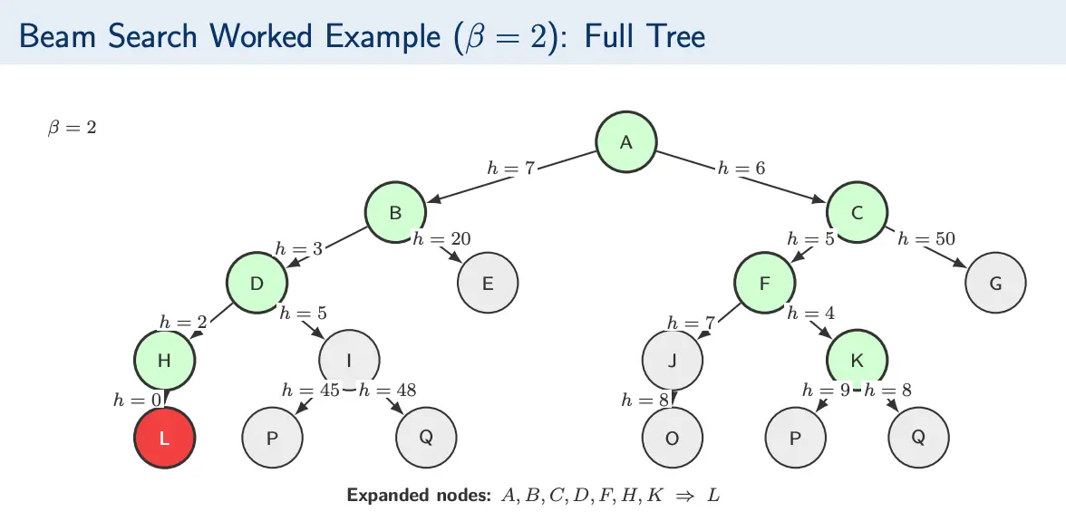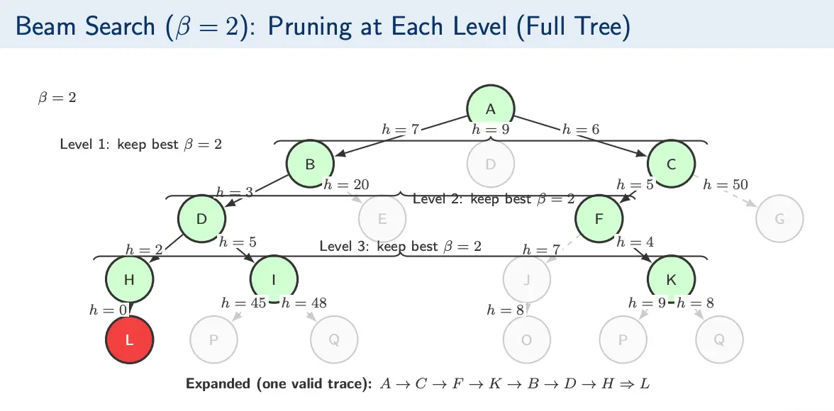 Essentially, at each depth we only expand the top nodes. is called the beam width and is the maximum number of nodes retained per level. Nodes are ranked using an evaluation function; all other nodes are discarded permanently.