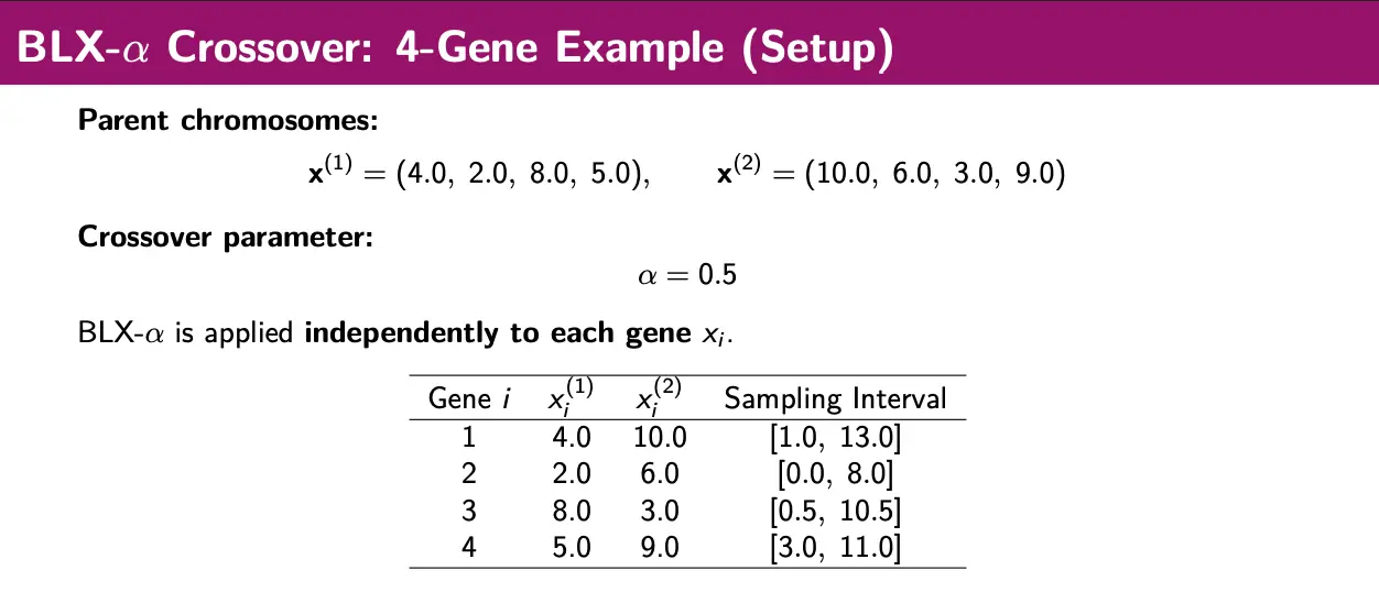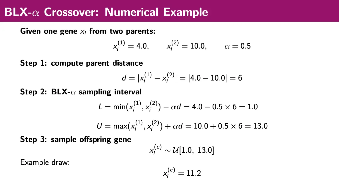 BLX- crossover constructs a uniform sampling interval from the parents based on the distance between them and a parameter .