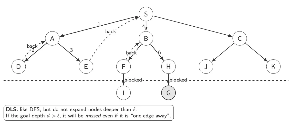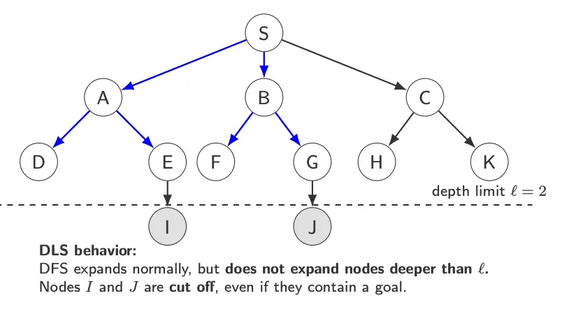 The rule is just to expand like DFS, but do not expand beyond depth . Thus, DLS finds a solution only if the goal depth . Otherwise, it returns cutoff/failure even if a solution might exist.