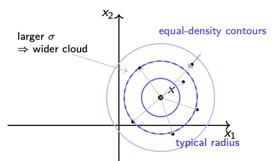 This is radially symmetric around , with equal variance in all directions. Thus, there is no preferred search direction, with a spherical sampling cloud.