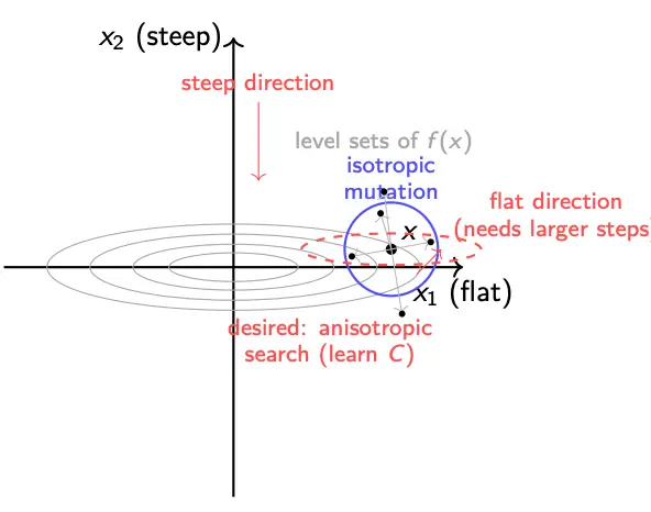 Even multiple coordinate-wise step sizes are not enough if the important search directions are rotated relative to the coordinate axes. Thus, we want to generalize the mutation to where is a learned covariance matrix.