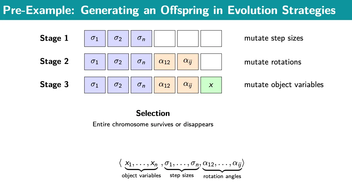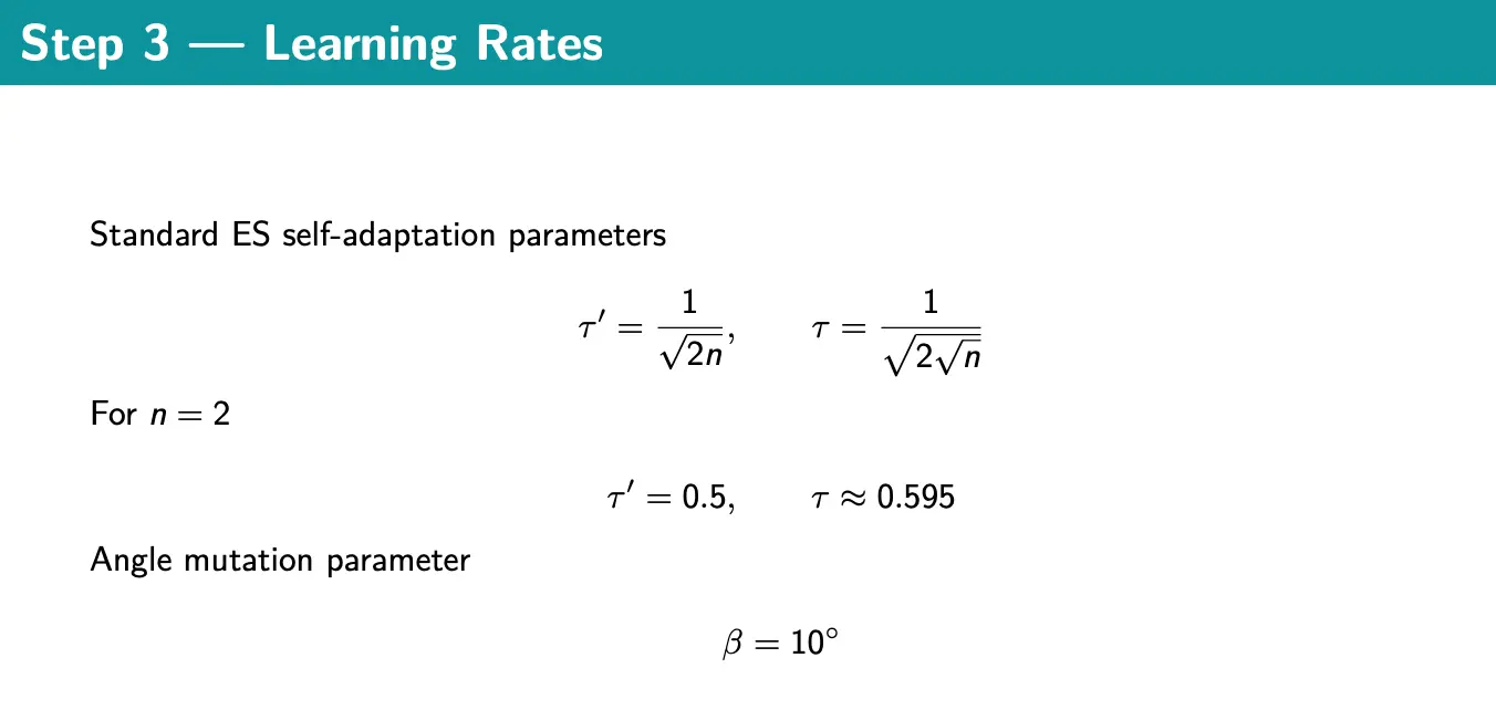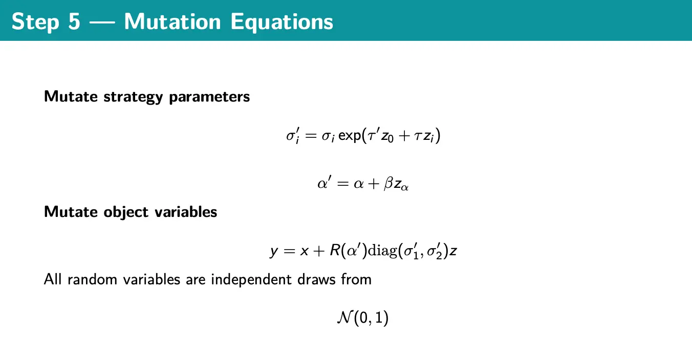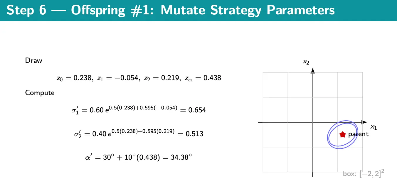 Note that it’s important that we first mutate the step size , and then mutate the solution using the new step size. This means that the new individual is evaluate in directly; the primary evaluation is that we can tell is good if is good, and the second evaluation is that we can tell is good if it produced a good .