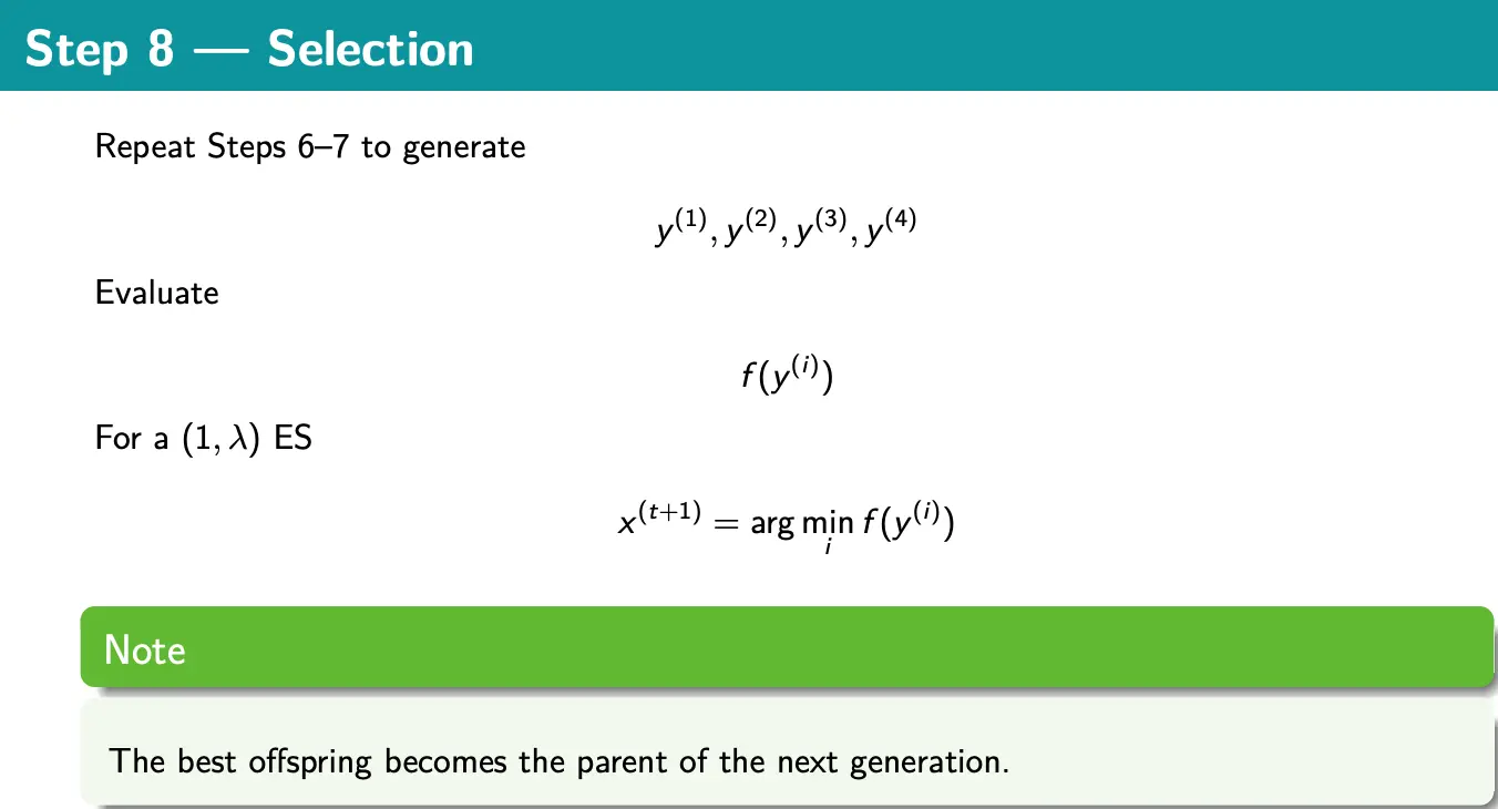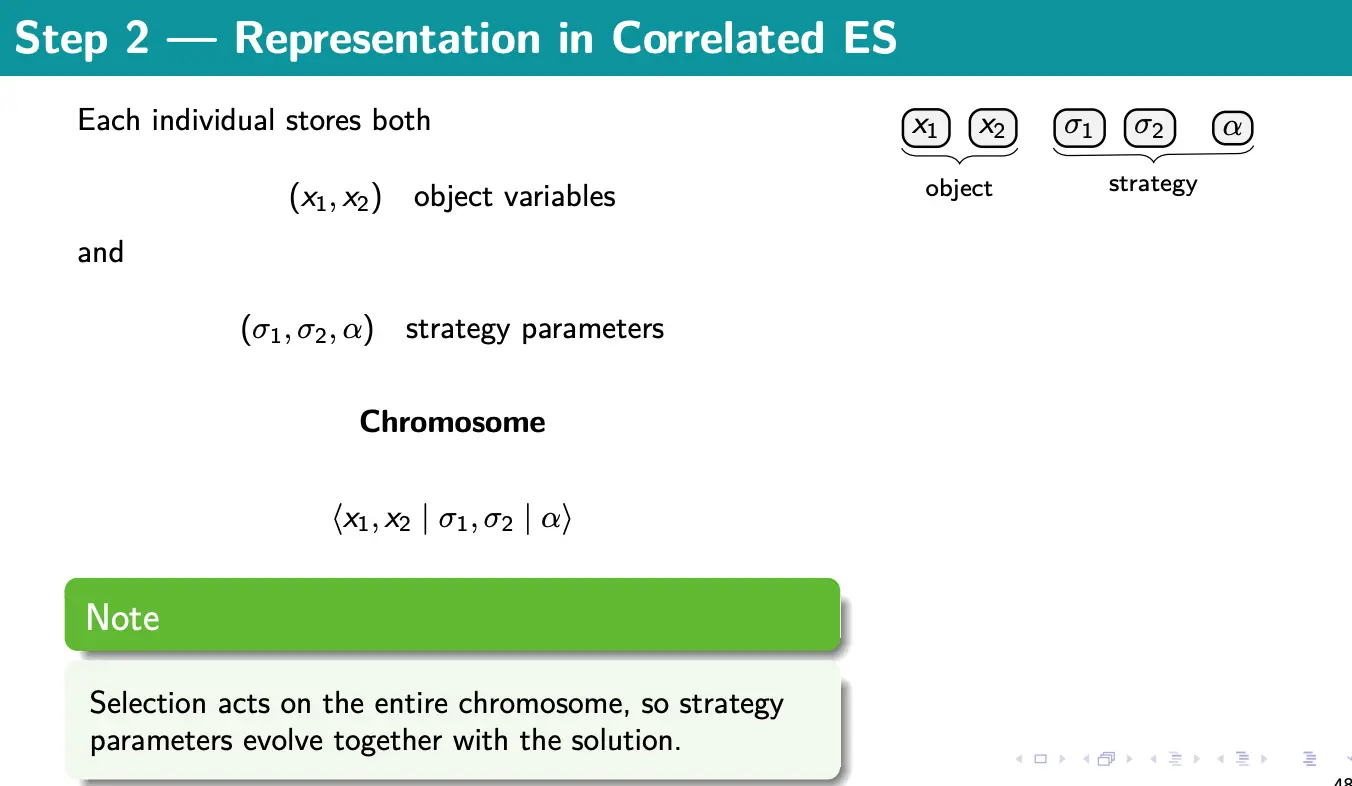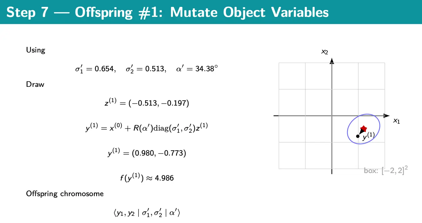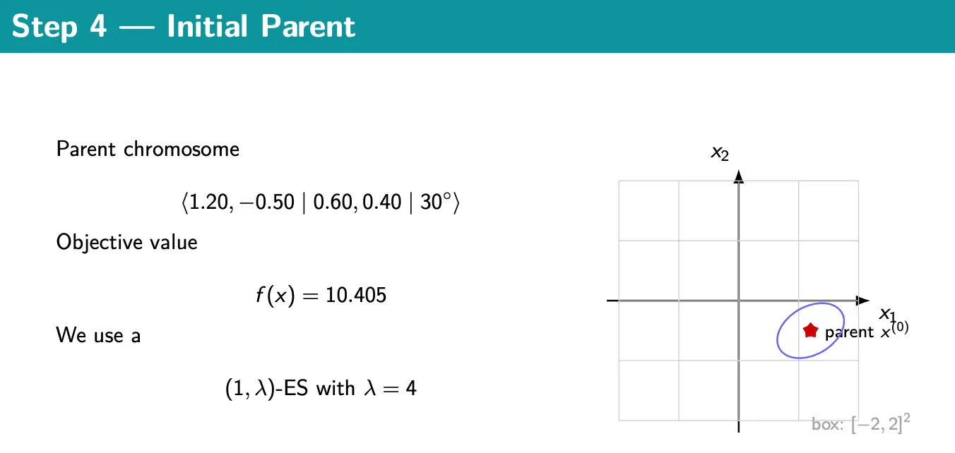 Note that it’s important that we first mutate the step size , and then mutate the solution using the new step size. This means that the new individual is evaluate in directly; the primary evaluation is that we can tell is good if is good, and the second evaluation is that we can tell is good if it produced a good .