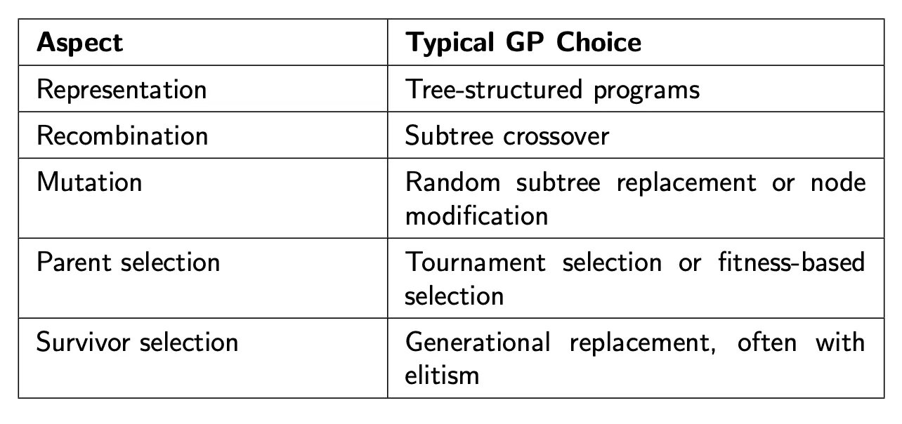 Why evolve programs instead of parameters? Some tasks are naturally program-synthesis tasks, such as symbolic regression, classification rules, controller design, signal transforms, and scheduling heuristics. For such problems, choosing the right form of the model is part of the challenge. Thus, GP is powerful when the model structure is unknown or when interpretability matters.
