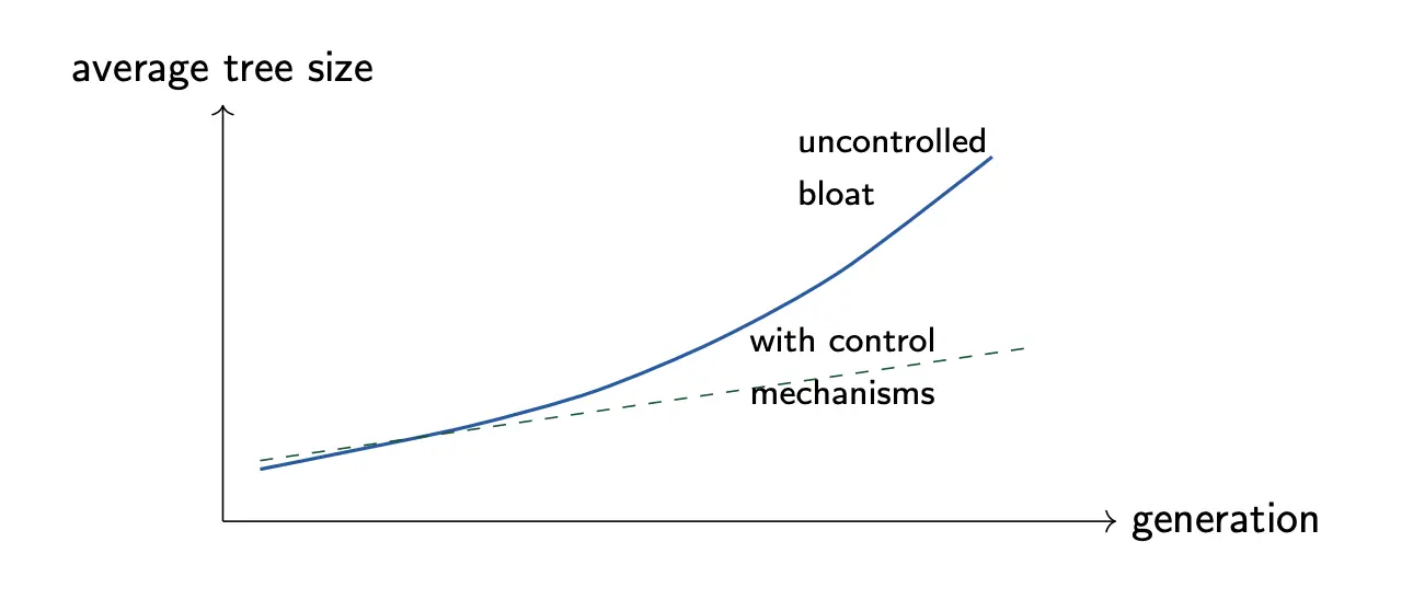 GP trees often grow larger and larger over generations, even when fitness barely improves. This phenomenon is called bloat. This is bad also because of slower evaluation and harder interpretation. One possible reason is structural bias: there are more large trees than small ones, and variations tend to increase tree size.