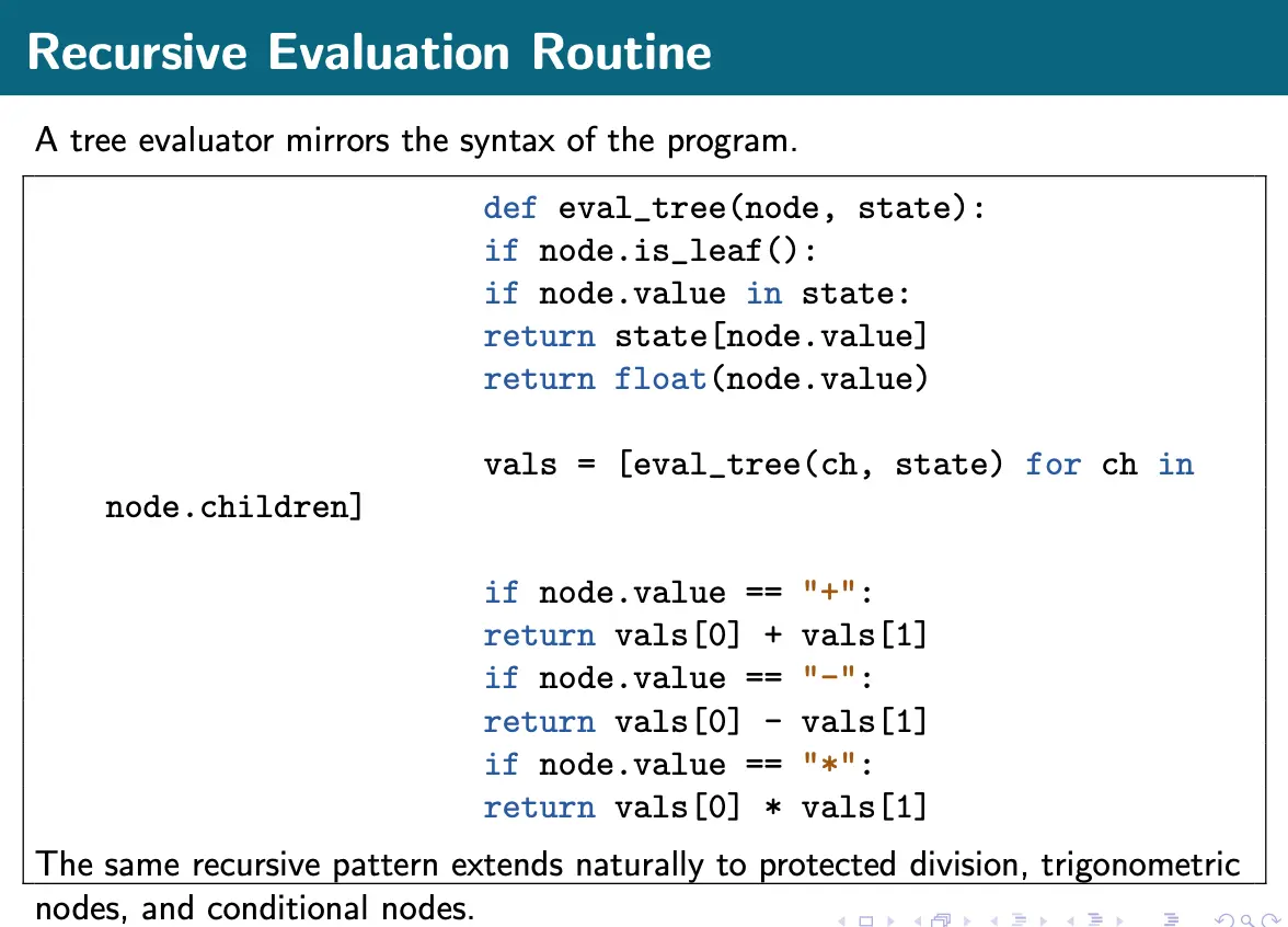 Unlike vector optimization, GP evaluates program behavior. For each individual we execute the program, observe its outputs on problem instances, and compute a task-specific performance measure. For example: regression error, classification accuracy, control survival time, energy consumption.