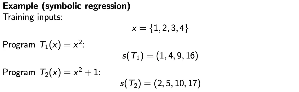 Traditional GP evolves syntax (program structure). Geometric semantic GP evolves semantics (program behavior). The core idea is that we represent each program by its output vector on a dataset:
