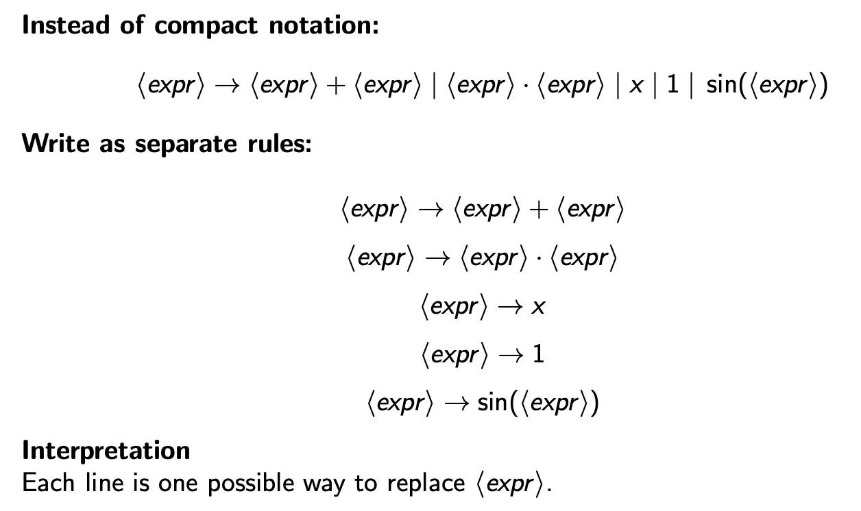 Basically, we start with , choose one of the right-hand side options, and replace the selected non-terminal. We then repeat this until only terminals remain. This means that first options create larger structures, while last options terminate expansion. Generation alternates between expansion and stopping.