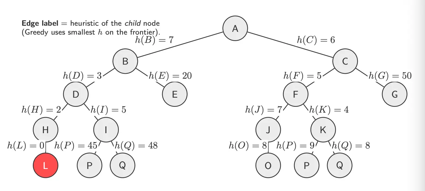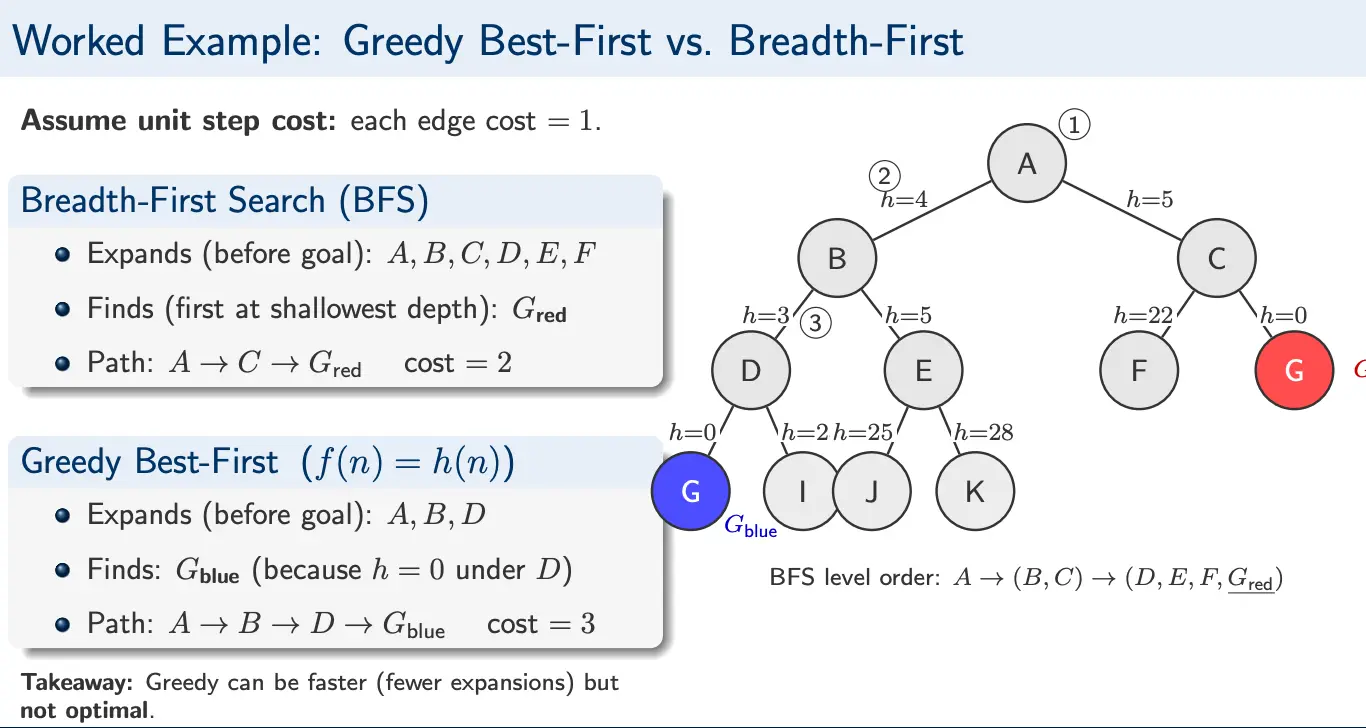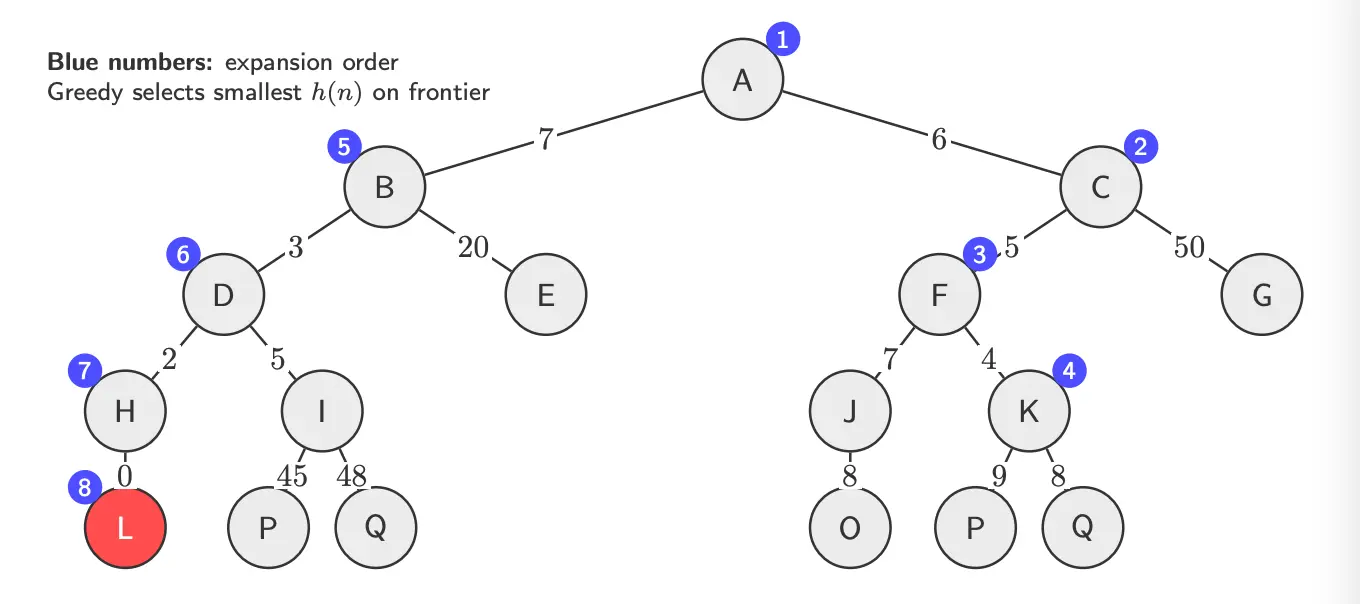 Greedy best-first search selects the nod that appears closest to the goal. This uses only the heuristic estimate , ignoring the cost accumulated so far.