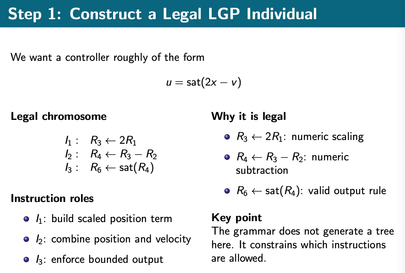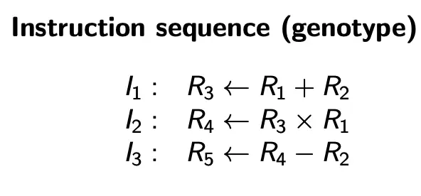 In linear genetic programming (LGP), an individual is not a tree but a sequence of instructions executed step by step. Program state is stored in registers , where each instruction reads some registers and writes to another. The final output is taken from a designated register. This makes GP resemble assembly code, 3-address code, or the intermediate representations used in compilers.