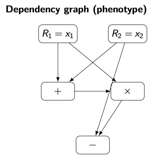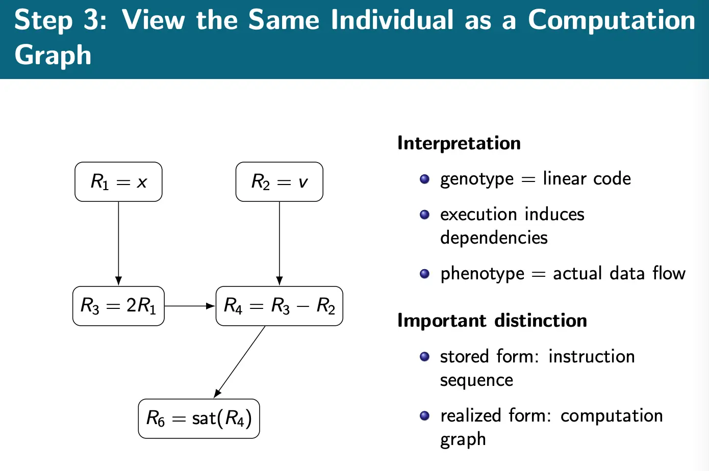 This program is evaluated sequentially, so intermediate values are explicit and reusable, although registers might be overwritten later. Unlike standard tree GP, the execution order is part of the genotype itself.