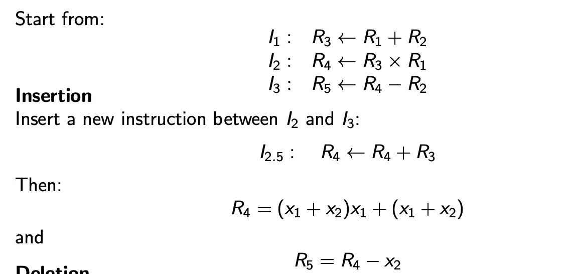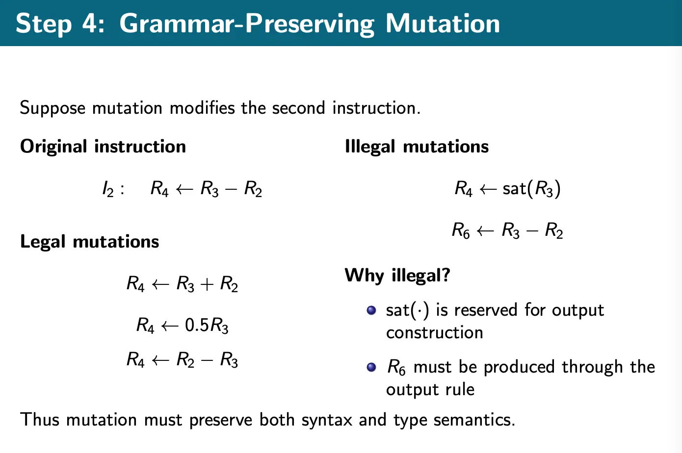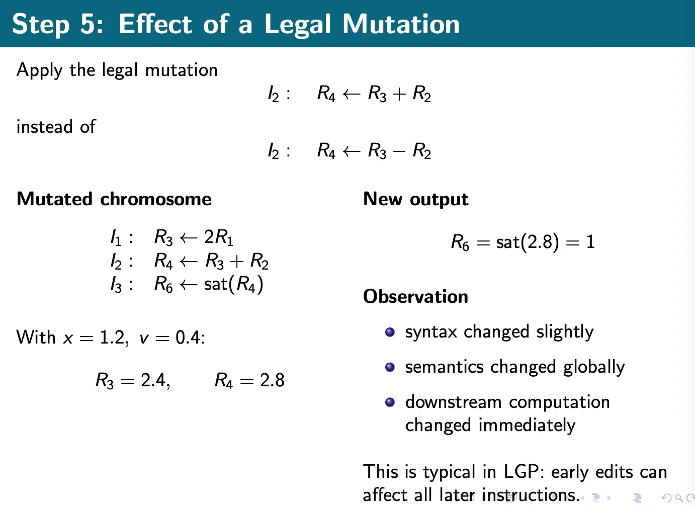 But deletion might introduce issues. If above is deleted, any later instruction depending on may become invalid unless repair. Hence, we often enforce legal register references, repair after mutation, or fixed/bounded program length.