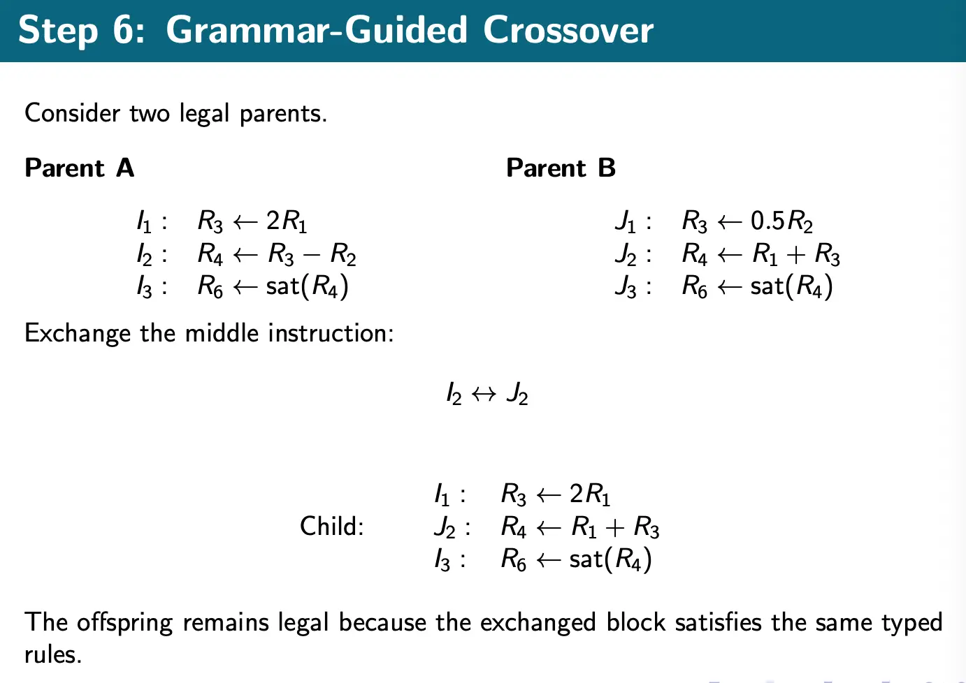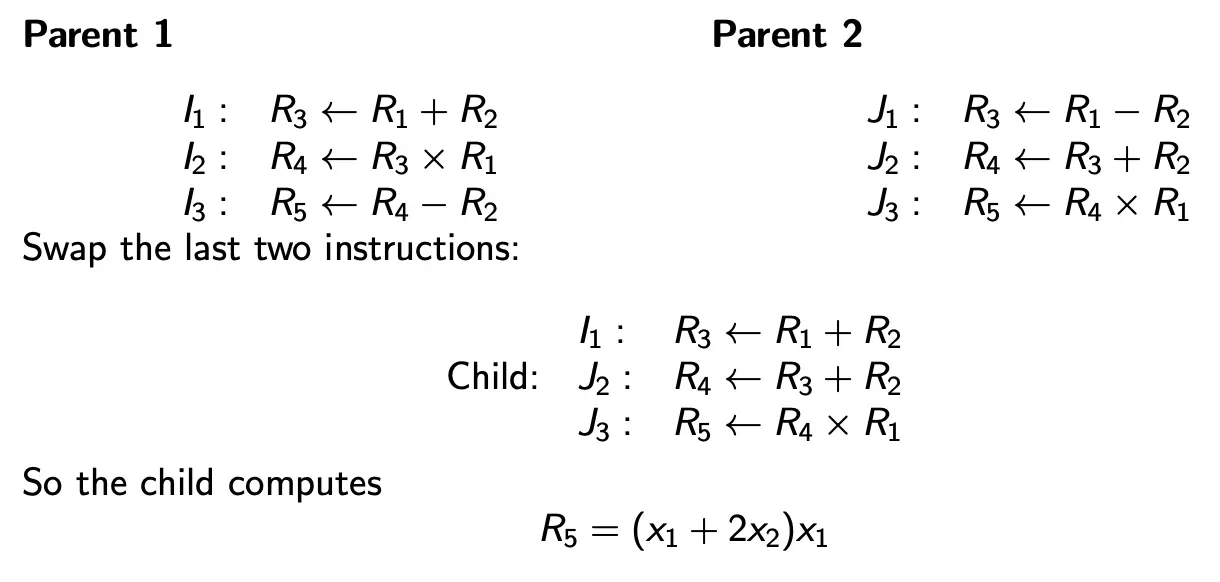 Basically, crossover recombines partial computations; unlike tree GP, recombination happens over instruction blocks. Register consistency is important for meaningful offspring.