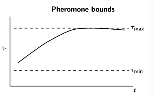 In MMAS, only the best ant deposits pheromone (iteration-best or best-so-far). Furthermore, we enforce bounds to prevent premature lock-in/stagnation: