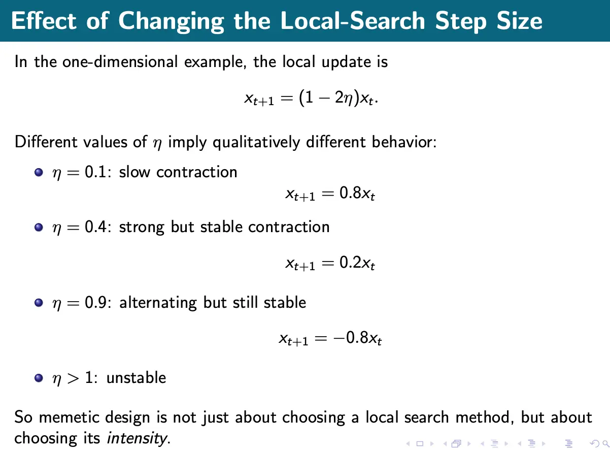 A fixed local-search policy might be suboptimal throughout the run. We can adapt the memetic intensity over time, such that early generations emphasize exploration, and later generations increase local refinement. Examples: