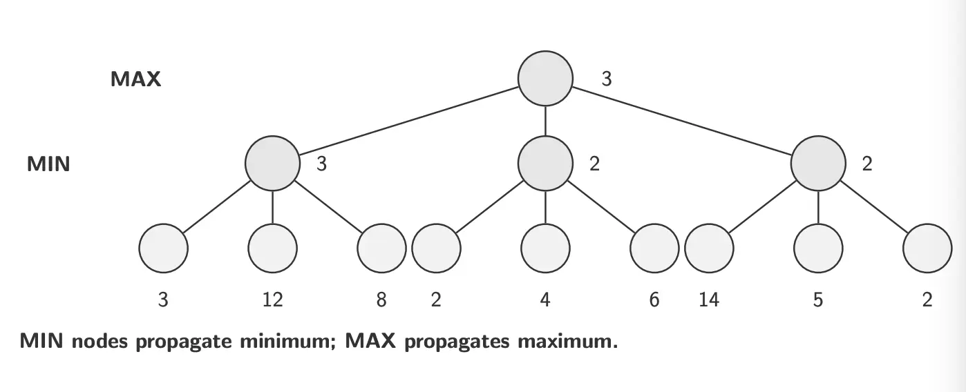 Given a game tree, the optimal strategy can be determined by examining the minimax value of each node, which we write as . The minimax value of a node is the utility of being in the corresponding state, assuming that both players play optimally from there to the end of the game. The minimax value of a terminal state is just its utility.