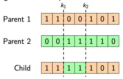 This has more mixing than one-point crossover, leading to greater disruption of building blocks. This improves exploration but fragments parental structure.
