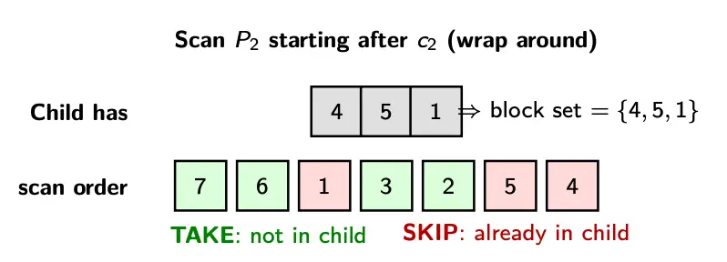 - Starting from position in (wrap around), fill empty child slots with elements not already present, preserving ‘s order.