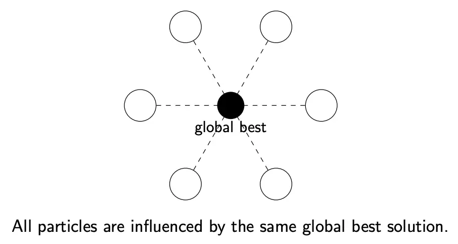 In global topology (gbest), every particle has access to the best position discovered by the entire swarm: