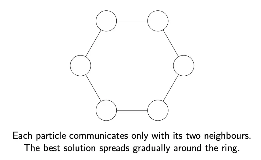 In local-best topology (lbest), every particle communicates with a limited neighborhood. Each particle uses: