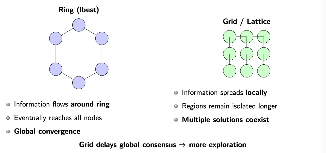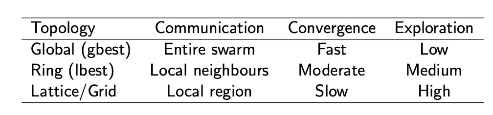 In particle swarm optimization, particles do not necessarily communicate with the entire swarm; instead, they may only interact with a subset of neighbours. Neighborhood topology defines which particles share information, how the best solution spreads throughout the swarm, and the balance between exploration and convergence.