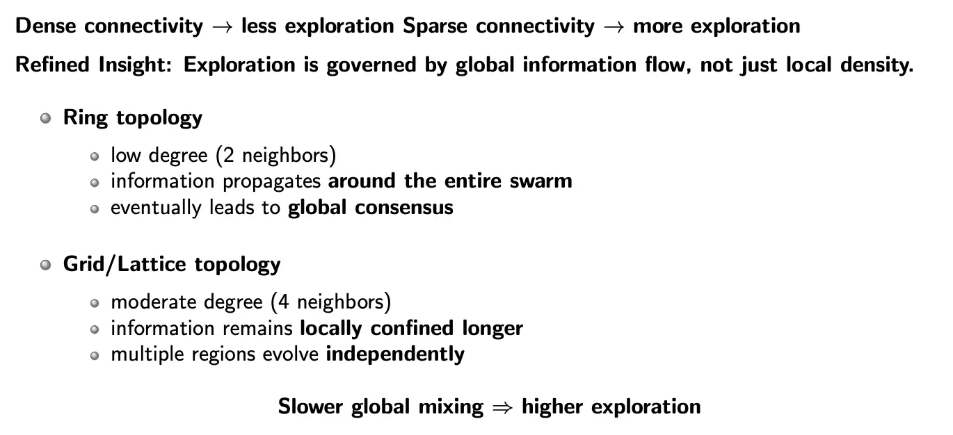 This means information propagation is slower. However, diversity is better, with more exploration.