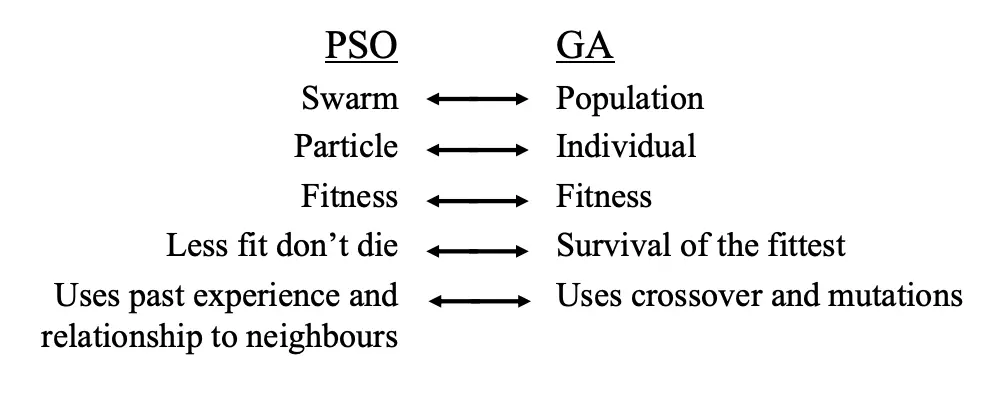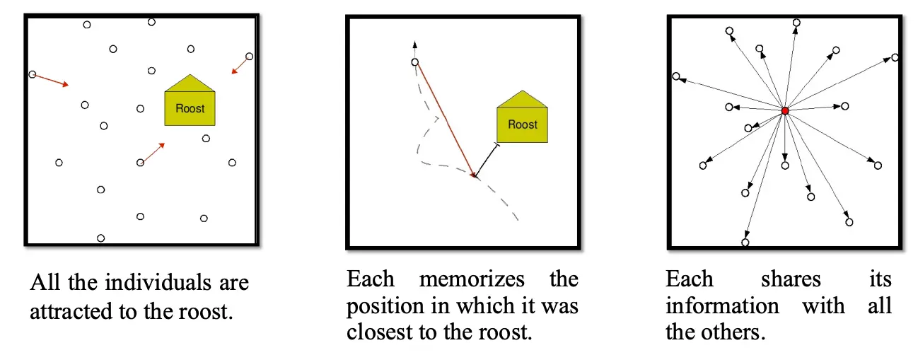The key to realize here is that if the distance to the roost was changed by some unknown function, the individuals land on the minimum. PSO was born from this idea.