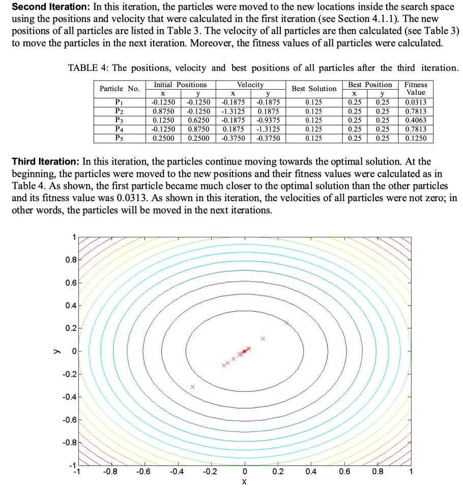 Each particle adjusts its velocity to move towards its personal best and the neighborhood best. After the velocity is updated, the particle adjusts its positions. This is governed by the following equations of motion: