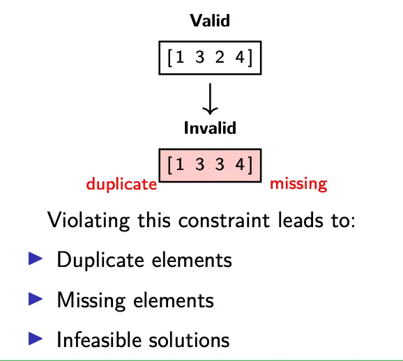 Binary or real-valued crossover, when applied naively to permutations, may produce duplicate or missing elements, such that the produced permutation is invalid. Specifically, a valid permutation must satisfy . This preserves the uniqueness of all elements.