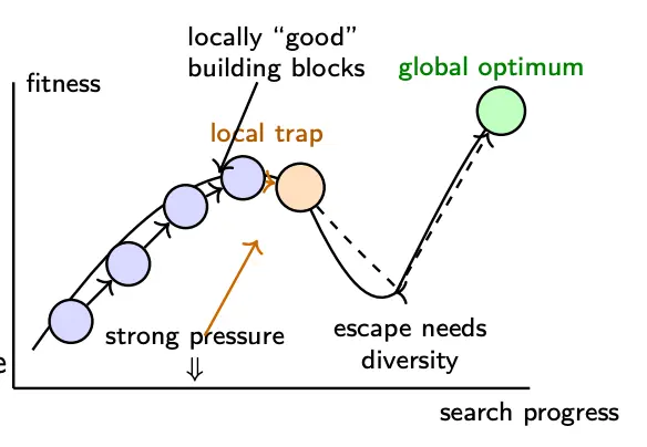 Selection amplifies locally attractive structure, but reducing diversity makes it harder to escape the trap.